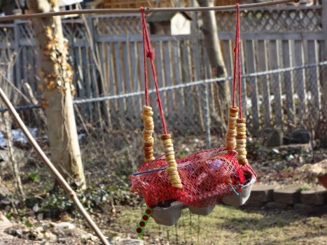 First we cut up some yarn into pieces, 4-8 inches are ideal for the birds to build their nests with. We also used colourful ribbon and leftover felt, Gray had a great time unravelling the yarn and throwing it all over the place. I cut an egg carton in half for our base and we filled it with our scraps of fabric. To cover it and keep the wind from blowing our scraps all over the yard we covered it with the netting from the top of a clementine container, quite a few fruits come in this netting.