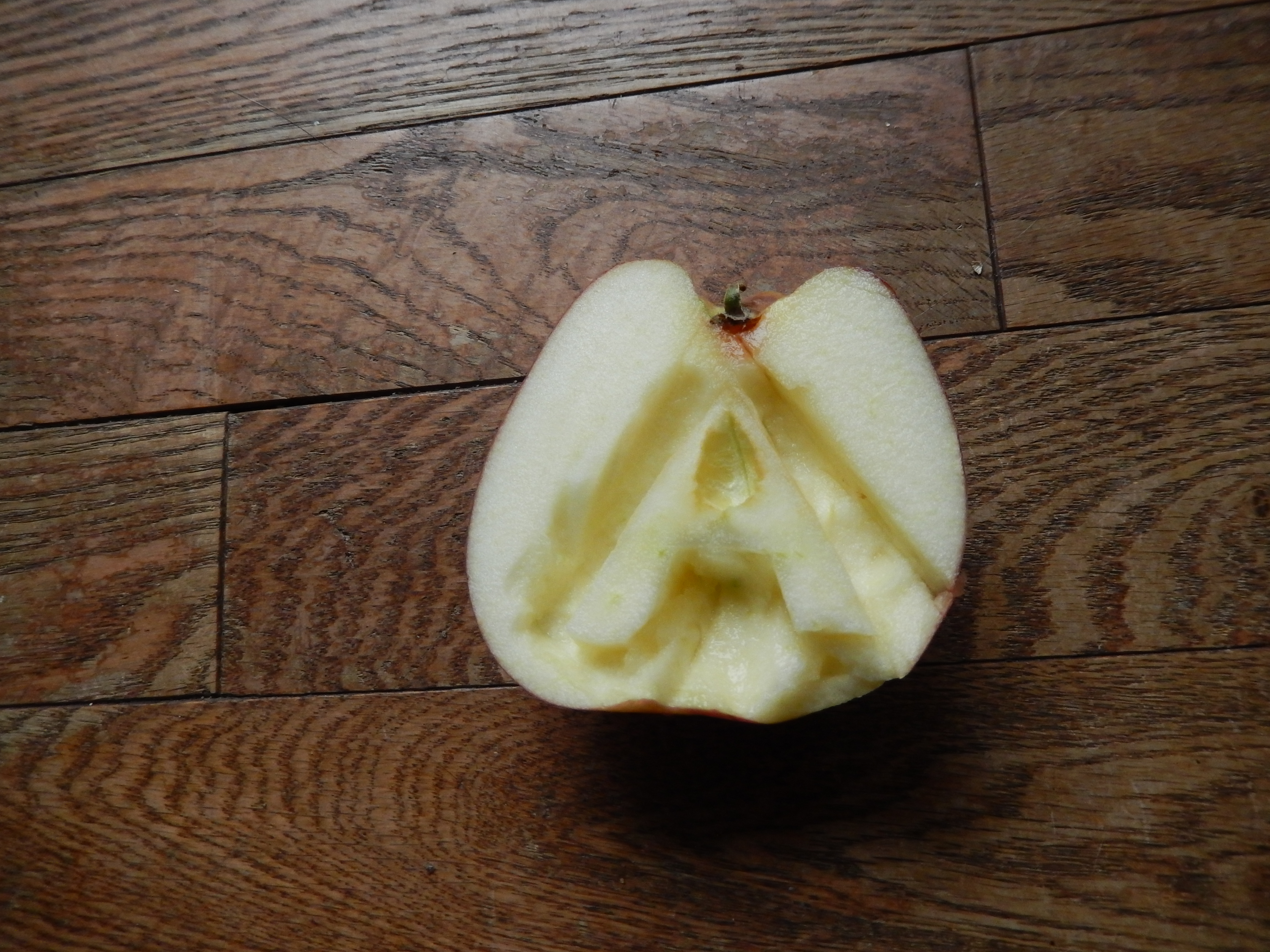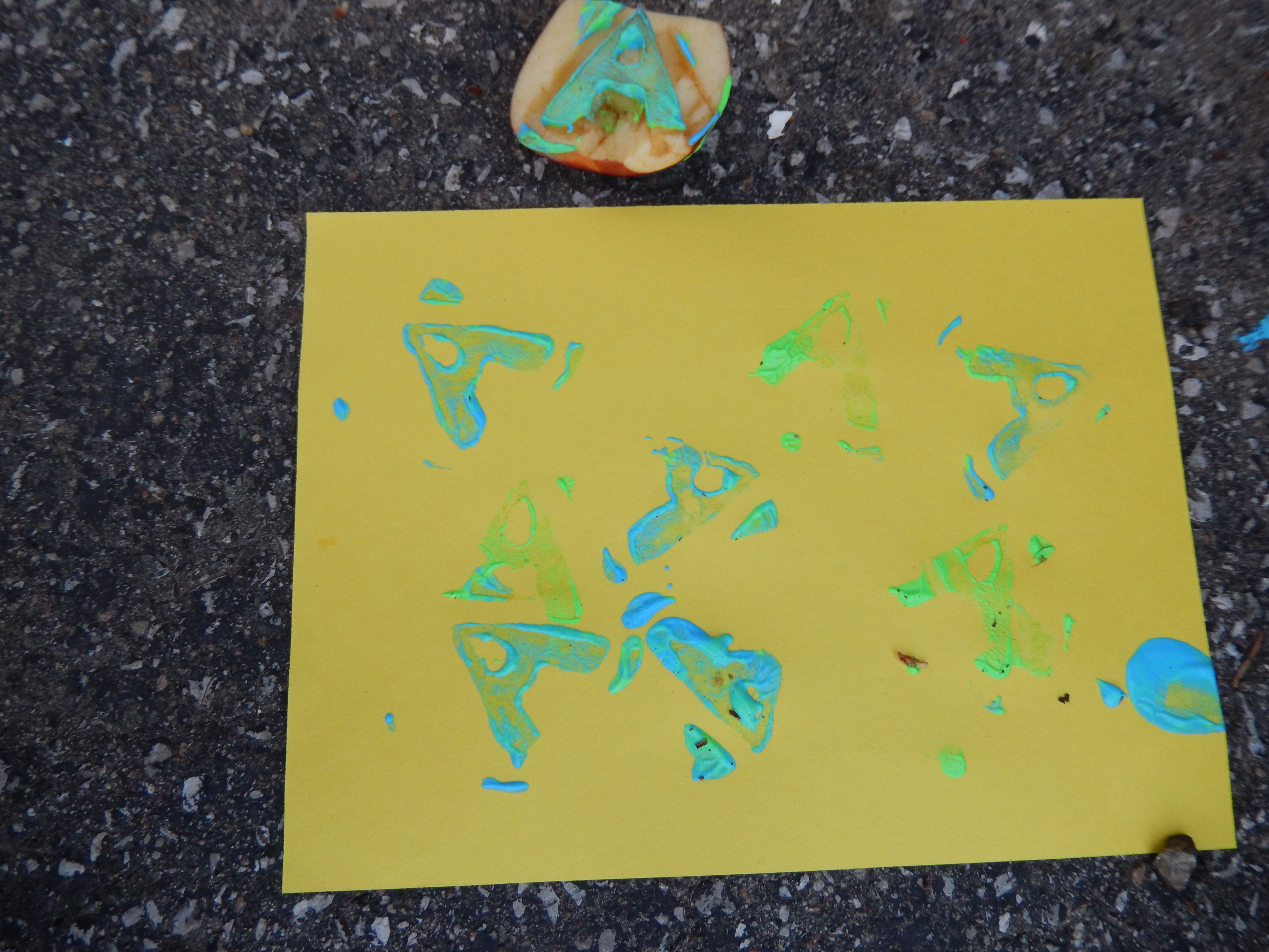After nap we did some stamping with a homemade stamp I made out of an apple. It was really simple to make, I just carved the letter A in half of an apple (I’m pretty sure a potato would also work) with a knife, using the apple seed divet as the hole in the A and stored it in an airtight container overnight so it wouldn’t get all mushy.