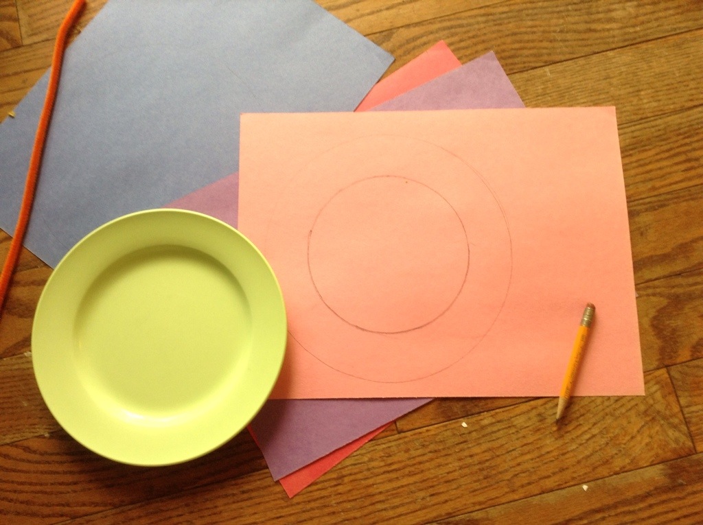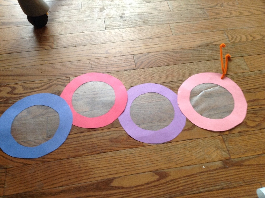 I really love these little bins, they really go over well with the little man. He always dutifully explores the different objects as I chat away about the letter we are learning about, and playing with the toys. As you all know I do the majority of my prep while he naps, and today was no different. We did a caterpillar craft, using some simple materials and a bit of imagination. You will need some construction paper, tape, a pencil, contact paper, scissors, a small plate and a pipe cleaner, all in the colours of your choice. This is a great craft for young toddlers because all they have to do is stick on the pieces, it is a bit off a collage, and my little one isn’t interested in much more than this at his age. Take your plate and use it as a stencil, tracing a circle onto each piece of construction paper, this will be making up the caterpillars body, use as many as you like, we used four.