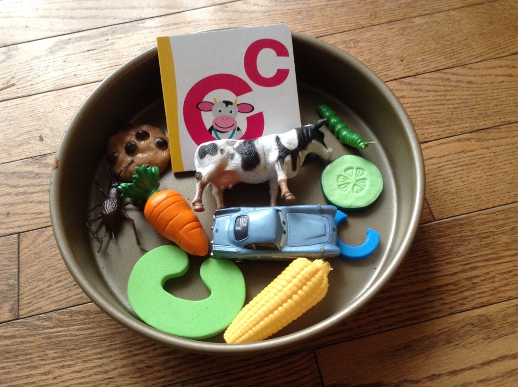 Today we worked on learning the alphabet, and today we learned about the letter C. We started off with our usual pie tin bin full of things that start with the letter C. We had a cow, a cricket, corn on the cob, cucumbers, a caterpillar, a car, a carrot and a cookie to explore, as well as our Letter C book.