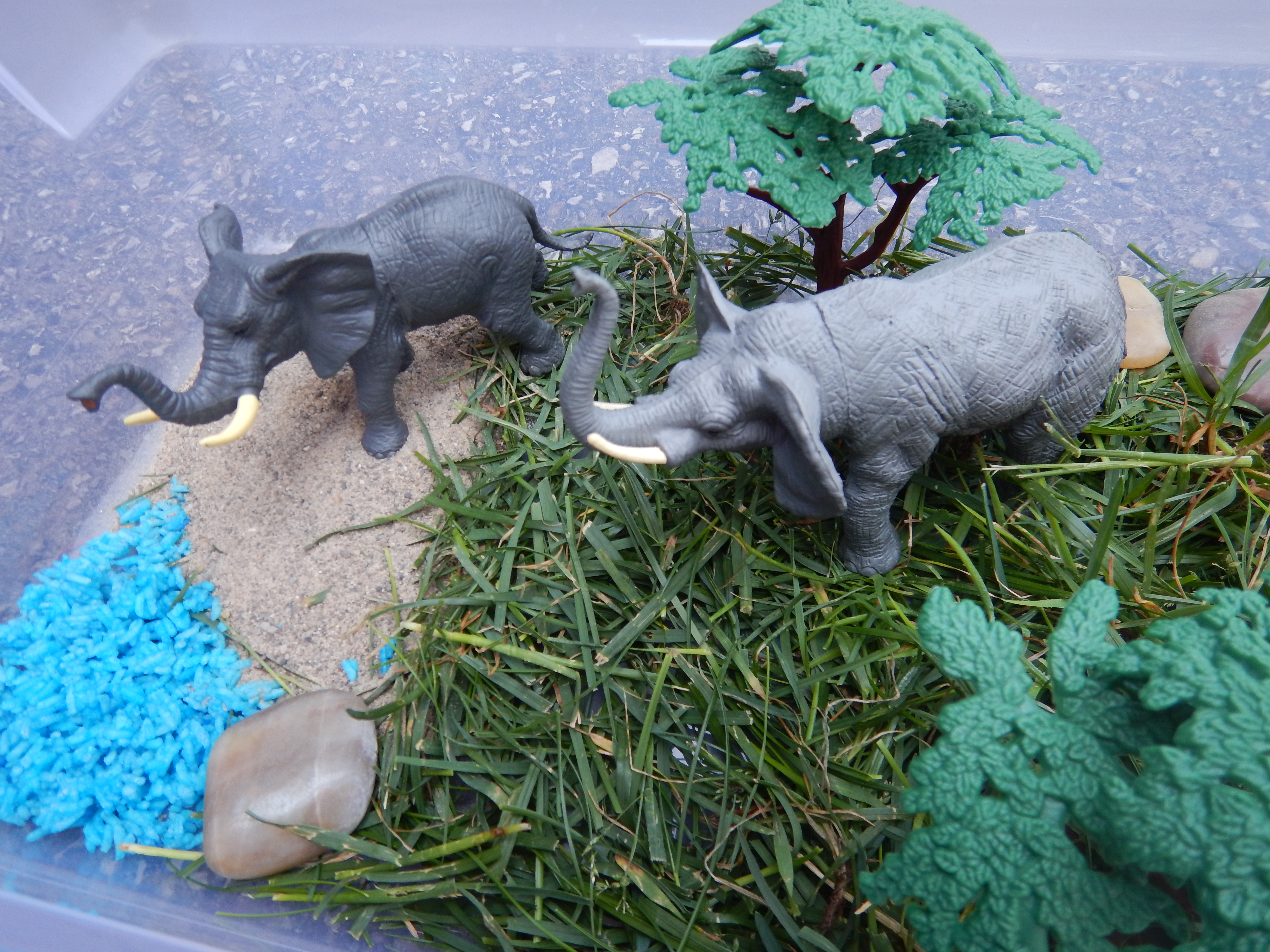 We examined each object and talked about them a bit while emphasizing that they start with the letter E. Then we moved onto our activity, an Elephant small world! This was ridiculously simple and easy to throw together in a couple minutes (which is exactly what happened) and was a big hit. I used a really small bin since my guy is pretty small and doesn’t need a huge one, feel free to use any size you wish! I headed outside and lined it with some fresh grass and sand to which smelled wonderful! Then I used some blue rice I had left over from a previous bin for the watering hole and threw in some rocks. You can make your own dyed rice by checking out Learn Play Imagines post about how to make vibrant, colourful rice of your own! Like I said, this bin is really a small, simple project but it is big with the little ones! I added some plastic trees and elephants, and it was all ready for my wee man.