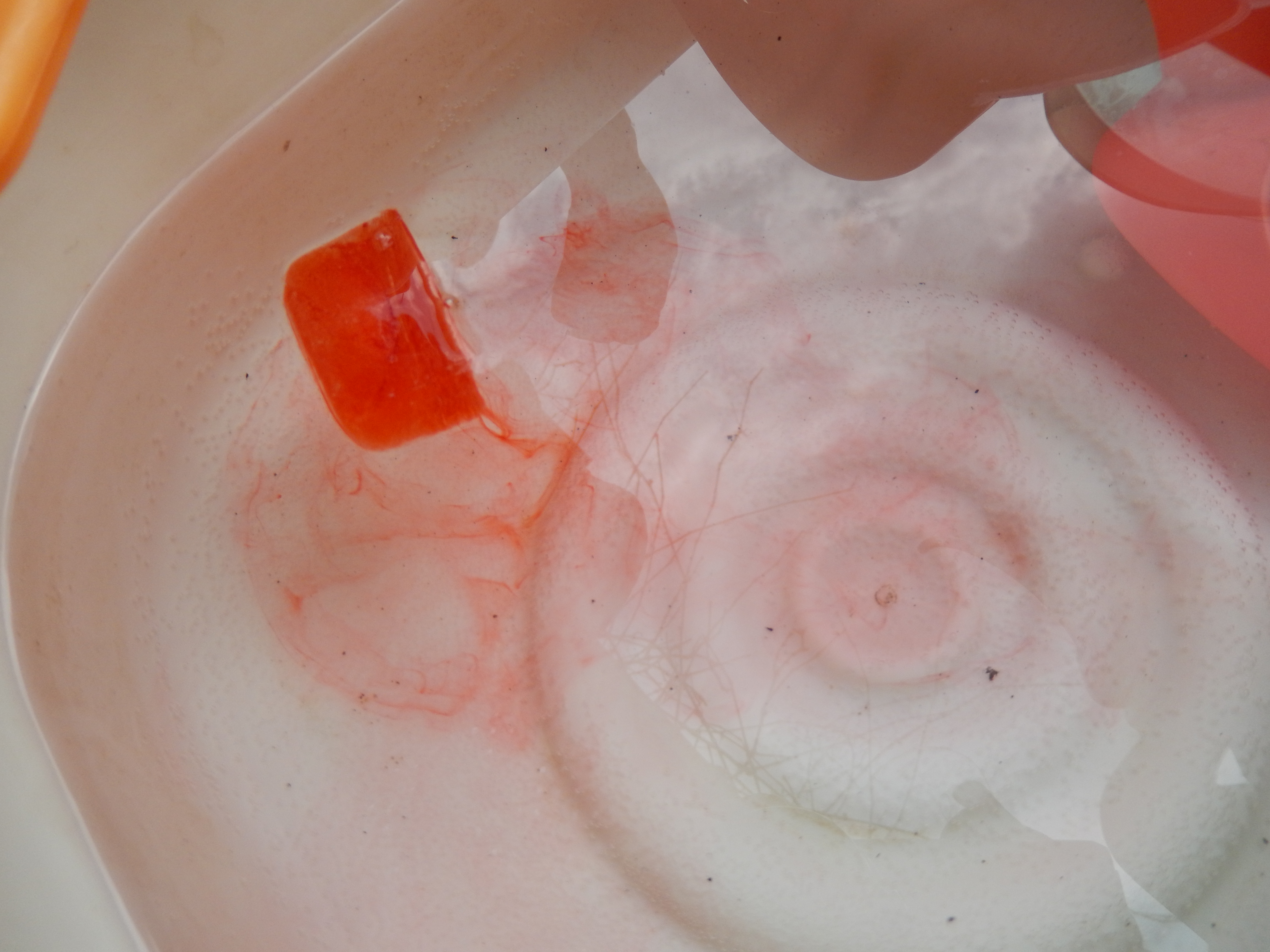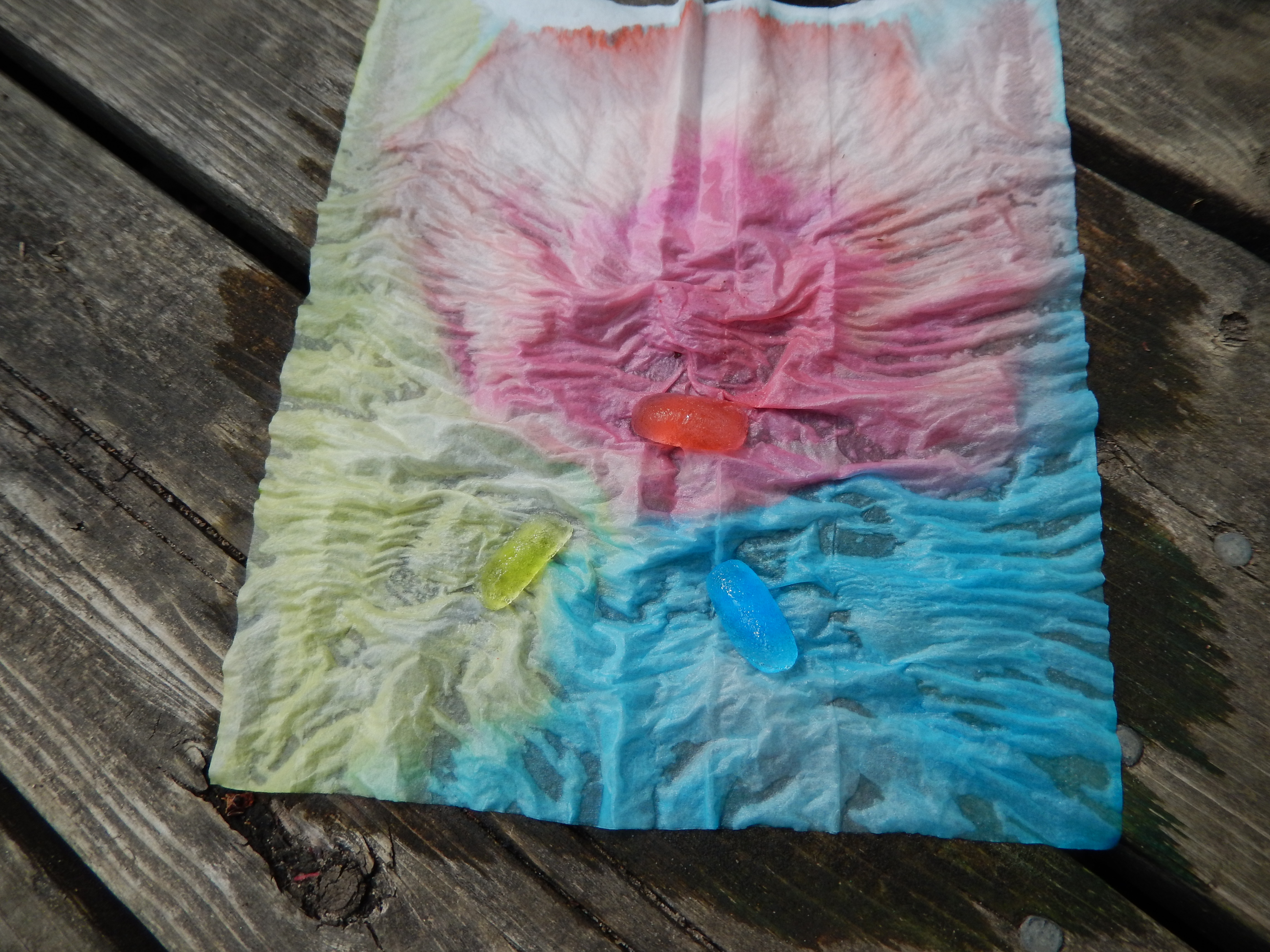 You still with me? Peel off the protective side of the contact paper circle and stick it onto the circle made out of construction paper, sticky side facing up. If you are confused here is your caterpillars body.