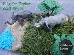 We examined each object and talked about them a bit while emphasizing that they start with the letter E. Then we moved onto our activity, an Elephant small world! This was ridiculously simple and easy to throw together in a couple minutes (which is exactly what happened) and was a big hit. I used a really small bin since my guy is pretty small and doesn’t need a huge one, feel free to use any size you wish! I headed outside and lined it with some fresh grass and sand to which smelled wonderful! Then I used some blue rice I had left over from a previous bin for the watering hole and threw in some rocks. You can make your own dyed rice by checking out Learn Play Imagines post about how to make vibrant, colourful rice of your own! Like I said, this bin is really a small, simple project but it is big with the little ones! I added some plastic trees and elephants, and it was all ready for my wee man.